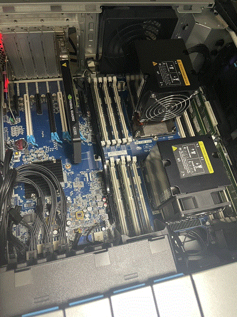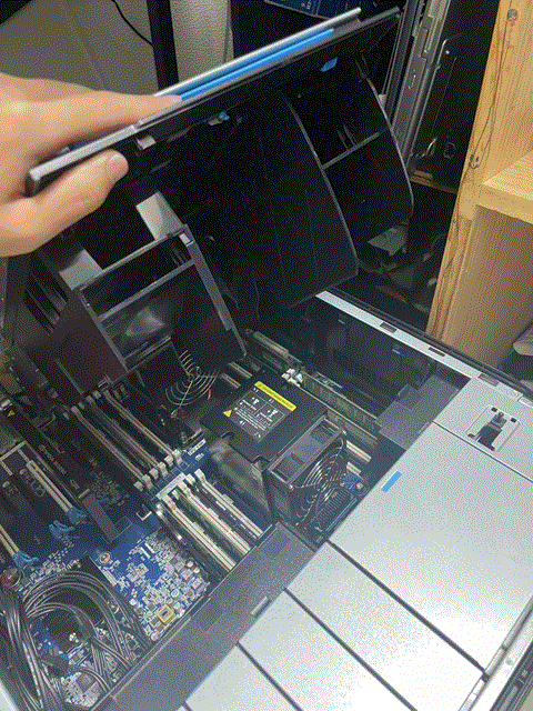 せっかくなので起動する前にパカっとな。 写真撮り忘れたんですがこの機種、サイドパネルがバコっとワンタッチで外れます。 さすが業務用。 サイドパネルを外すと、こんな感じでエアフローを制御するための部品が出てきます。 CPUが2個直列に並んでいますが、1個目のCPUの廃熱が2個目に直撃、なんてことは無いようにちゃんと設計されてます。さすが業務用。