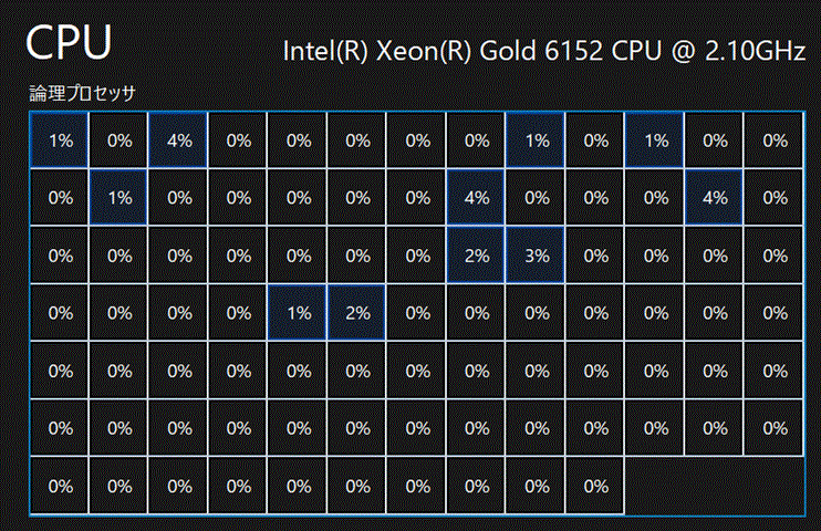 今回はRAIDとか組まないので、 インストールは普通のWindowsと一緒。 セットアップが終わったところで、早速タスクマネージャーを...! これが開いてびっくり、スレッドごとの使用率が表示できる「論理プロセッサ」表示にすると、グラフになりません。使用率が枠の中に数字で出ます。 こんな表示、存在したのか...